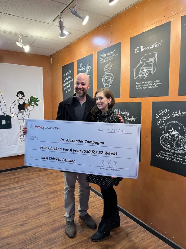 제너시스BBQ가 지난 11일 저녁 미국 뉴욕주 버펄로에 거주하는 알렉산더와 안드레아 캄파냐 부부에게 1년간 BBQ치킨을 무료로 먹을 수 있는 상품권을 선물했습니다.