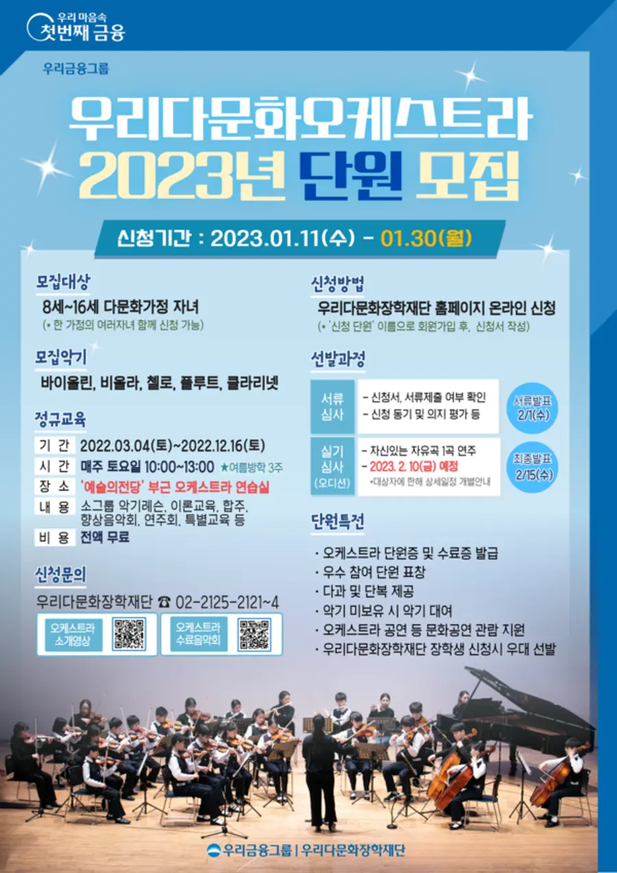 우리금융그룹 우리다문화장학재단(이사장 손태승)에서 '2023년 우리다문화오케스트라'에 참여할 다문화자녀를 모집한다.