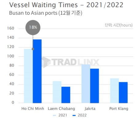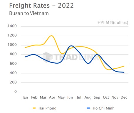 베트남 수출 운임은 다른 지역과 마찬가지로 일년새 하락했다. 트레드링스 운임지표에 따르면 지난해 1월 대비 12월 수출 운임이 하이퐁 42%, 호치민 44%로 감소했다. 하지만 여전히 코로나 이전보다는 높은 수준이다.