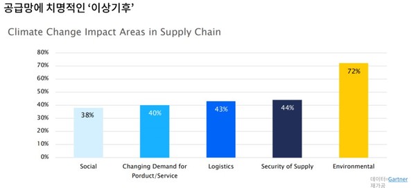 한편, 전세계 공급망 분야에 가장 큰 영향을 미치는 요인은 기후 변화 등 환경요인인 것으로 조사됐다. 리서치그룹 가트너 자료에 따르면 전력난, 홍수,산불, 폭염 같은 물리적 위험이 공급망에 미치는 요인은 72%로 가장 높았다. 이어 공급보장성 문제(44%), 물류(43%) 등이다.
