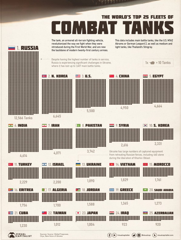 러시아와 전쟁중인 우크라이나의 탱크보유댓수는 1890대에 그쳐 세계 순위가 13위에 그쳤다. 우크라이나는 러시아의 1/10수준의 탱크를 보유, 러시아의 빠른 승리에 대한 초기 예측에도 불구하고, 숫자적으로 우세한 적들을 돌려세웠다. 원래 소련 시절 개량형 T-64와 폴란드와 체코의 T-72 기부금으로 무장한 우크라이나의 탱크 병력은 러시아 병사들이 달아난 뒤 이들이 남겨둔 나포된 군사 장비 덕분에 탱크 보유대수가 부쩍 늘었다.