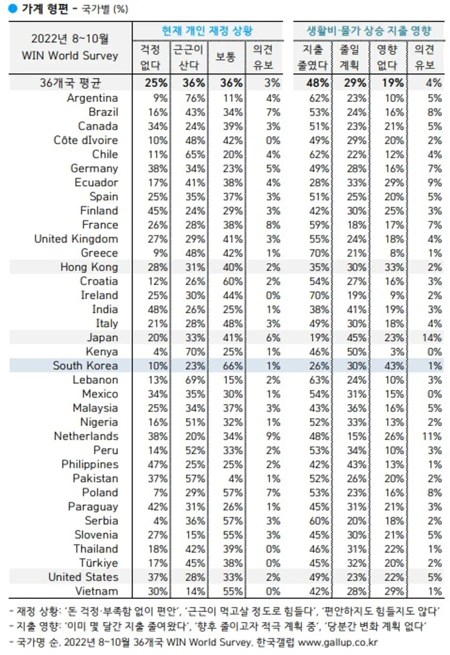 19일 전 대륙에서 시장조사와 여론조사를 수행중인 글로벌 네트워크 WIN(worldwide independent network of Market Research)에 따르면 전세계 주요 36개국 국민들이 느끼는 체감 재정상황을 묻는 설문에, 응답자의 36%가 '근근이 살아가고 있다'며 살림살이가 어렵다고 답했다. 걱정없다와 보통이라는 답변은 각각 25%와 36%로 조사됐다.