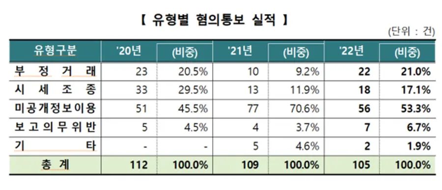 미공개정보 이용사건이 56건으로 가장 높은 비중(53.3%)을 차지했으며, 부정거래 22건과 시세조종 18건 순이었다.
