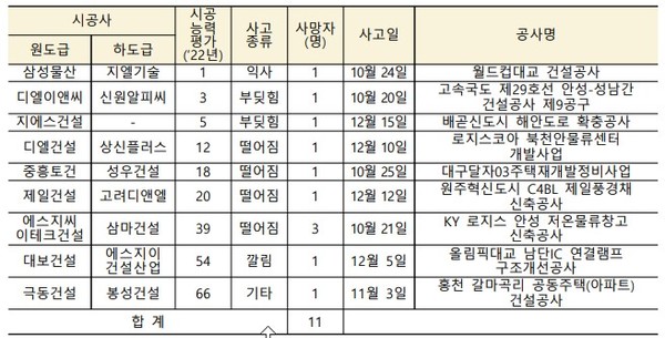 이에 따르면 사망사고가 발생한 100대 건설사는 총 9개 사로 집계됐다. 에스지씨이테크건설에서 3명의 사망자가 발생했다. 이외 삼성물산, DL이앤씨, GS건설, DL건설, 증흥토건, 제일건설, 대보건설, 극동건설 등 8개사에서도 사망사고가 있었다.