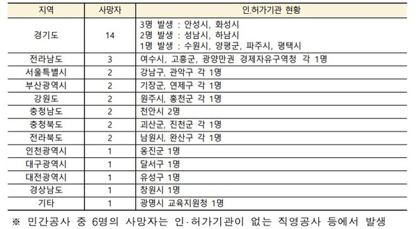 민간공사에서 발생한 사망자는 40명으로 전년 동기 대비 2명 증가했고, 사망자가 가장 많았던 인·허가 기관은 안성시, 화성시로 각 3명의 사망자가 있었다.