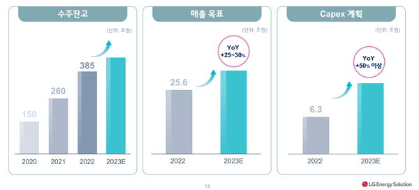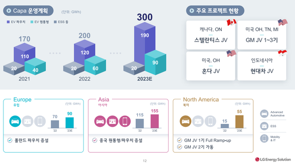 LG에너지솔루션은 "올해 EV를 중심으로 전년대비 33% 증가할 것으로 예상되는 배터리 수요 성장이, 지역별로는 북미 지역이 성장을 견인할 것으로 전망된다"며 "근본적인 제품 경쟁력 우위 및 산업 내 글로벌 선두 입지 강화를 추진하겠다"고 밝혔다.