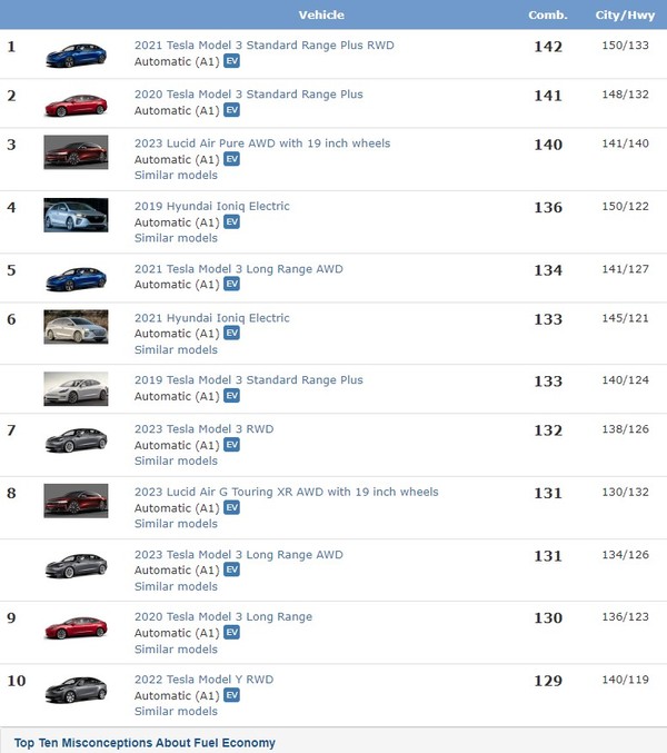 신차 구매 고객들이 차량 선택시 디자인, 품질, 안전성보다 더 중요하게 고려하는 요소가 연비이다. 그렇다면 현재 최상의 연비를 자랑하는 연비왕은 무엇일까? 27일 미국 에너지부와 환경보호국(www.fueleconomy.gov)에 따르면 지금까지 연비가 가장 좋은 차량은 2021년산 테슬라 모델3 스탠다드 레인지 플러스 RWD인 것으로 조사됐다. 2023년산 테슬라 모델3 RWD는 7위에 그쳤다.