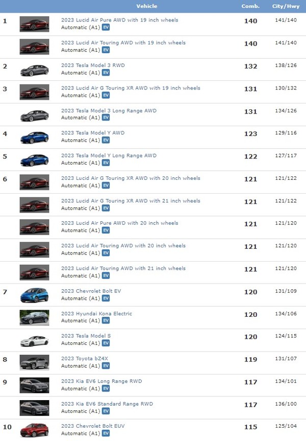 2023년 루시드 에어 퓨어 AWD모델과 루시드 에어 투어링 QWD모델이 공동 연비왕에 올랐다. 테슬라모델3 RWD는 도심 138/고속도로 126으로 루시드 차량에 비해 주행가능거리가 상대적으로 짧았다.