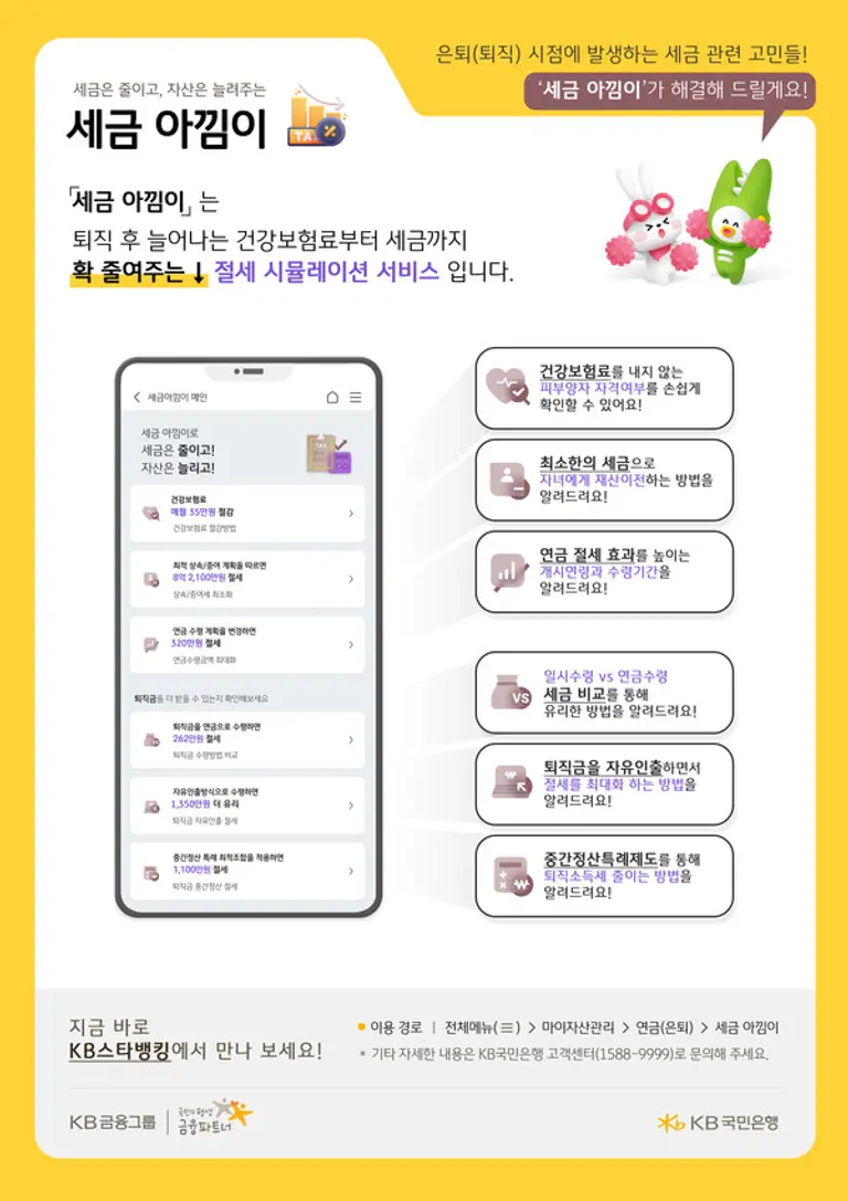27일 KB국민은행(은행장 이재근)은 퇴직이 후 건강보험료 부담 완화부터 절세를 위한 솔루션까지 원스톱으로 제공하는 ‘세금 아낌이’ 서비스를 출시한다고 밝혔다. 세금 아낌이 서비스는 절세 최적화 시뮬레이션을 통해 단순 계산기 수준을 넘어 은퇴시기 발생하는 세금 관련 고민들에 대한 구체적이고 다양한 절세 계획을 제공한다는 점이 특징이다.
