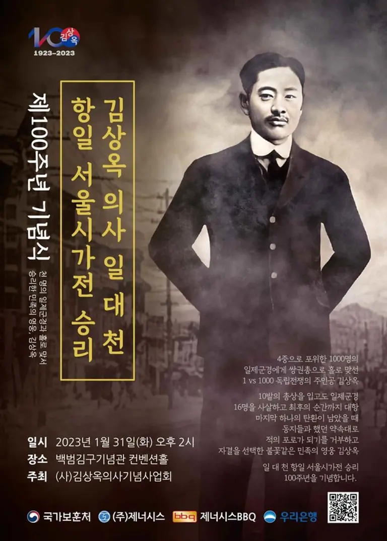 제너시스BBQ 그룹(회장 윤홍근)이 용산구 백범김구기념관 컨벤션홀에서 31일 열리는 '김상옥 의사 일대천 항일 서울시가전 승리 100주년 기념식’을 후원한다고 30일 밝혔다.