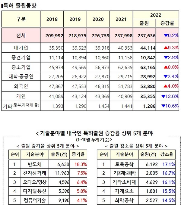 30일 특허청이 발표한 2022년 특허출원 동향에 따르면 지난해 총특허출원건수는 23만7636건으로 1년전에 비해 0.2% 감소했다. 대기업 특허건수가 4만4114건으로 전년비 9.3% 증가한 반면 개인의 특허건수는 3만5355건으로 전년대비 13.6% 줄었다. 중견기업과 대학과 공공연구기관 특허 출원 역시 감소했다. 외국인의 국내 특허는4% 늘었다.