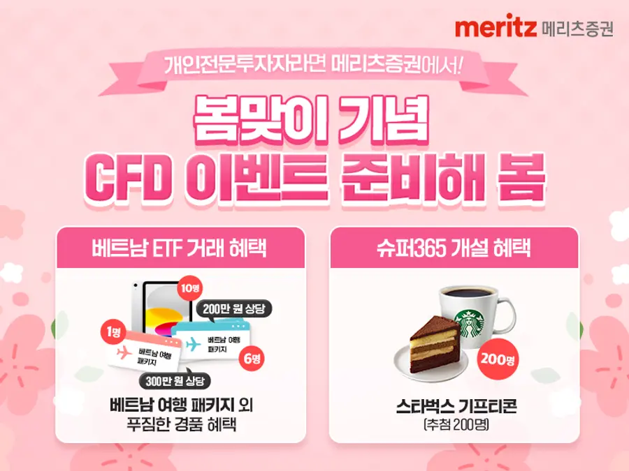 CFD 계좌 보유고객이 슈퍼365 계좌를개설하고 4월30일까지 잔고 100만원 이상을 유지하면 최대 200명에게 추첨을 통해 스타벅스기프티콘을 지급한다.