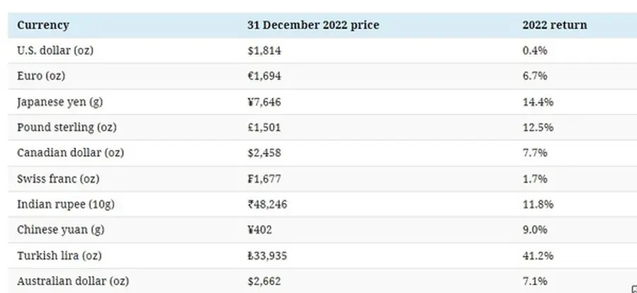 8일 글로벌데이터인포그래픽업체 비주얼 캐피탈리스트(Visual Capitalist)가 세계금협회(World Gold Council)의 데이타를 기반으로 작성한 2022년 주요 통화 대비 금 수익률을 조사한 자료에 따르면 지난해 기록적인 인플레이션과 세계 경제 성장 둔화 등으로 금 가격은 사상 최고치를 경신할 수준으로 치솟았다.