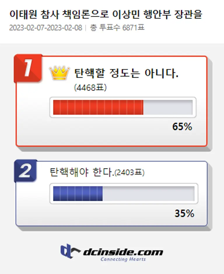 커뮤니티 포털사이트 디시인사이드(대표 김유식)는 자사 이용자들을 대상으로 이상민 행안부 장관 탄핵에 대한 긴급 설문 조사 결과, 총 투표수 6,871표 중 4,468(65%)표가 '탄핵할 정도는 아니다'라고 답했다고 8일 밝혔다.