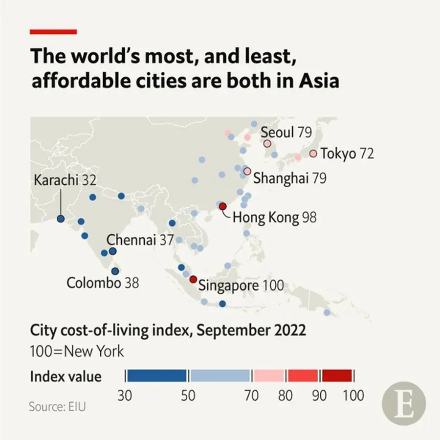 9일 이코노미스트가 자매회사인 EIU가 매년 두차례 집계하는 전세계 생활비 조사를 인용해 보도한 기사에 따르면 아시아는 세계에서 가장 물가가 비싼 도시와 가장 싼 도시가 공존하는 지역이다.