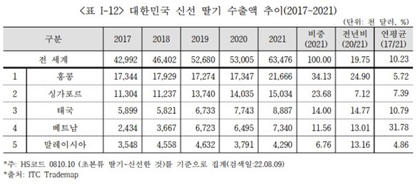 한국농수산식품유통공사의 '한국·일본산 프리미엄 딸기 주력 수출시장 조사'에 따르면 '대한민국의 신선 딸기 수출액'은 2021년 한화 약 825억원(6347만6천달러)에 이른다. 2017년부터 2021년까지 연평균 10%이상의 성장세다.