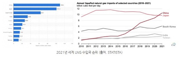 메탄은 이산화탄소보다 온실효과가 80배 더 높은 것으로 알려질 정도로 전세계가 겪고 있는 기후위기상황에서 이른바 '기후 빌런'으로 통한다. 우리나라는 2017년 이래 LNG수입국 3위를 기록중이다. 중국의 본격적인 산업화가 진척되기 이전인 2016년까지는 일본에 이어 2위를 기록했다.