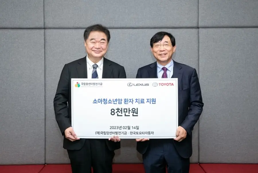한국토요타자동차는 소아청소년 및 취약계층 암환자 치료 지원을 위해 지난 14일 국립암센터에 기부금 8000만원을 전달했다고 밝혔다.
