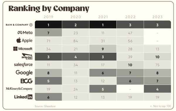 구글은 여전히 6 - 8위권에 머무르는 반면, 맥킨지의 강세가 두드러진다. 맥킨지는 2019년과 2020년 각각 19위와 24위에 올랐다. 2021년 5위권으로 급등했지만 지난해 순위권 밖으로 밀렸다. 올해 평가에서는 4위로 재차 순위를 끌어올렸다.