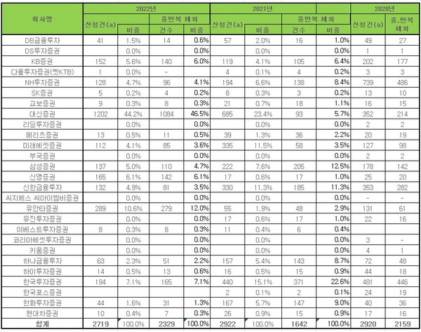 유안타증권이 289건(10.6%), 한국투자증권 194건(7.4%)로 뒤이었다. 신영증권과 KB증권도 회사 규모 대비 소송건수가 상대적으로 높았다.