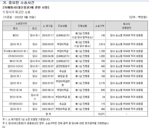 대신증권은 지난해 9월말로 끝나는 3분기보고서에서 피소된 소송가액이 100억원을 넘는다고 공시했다.