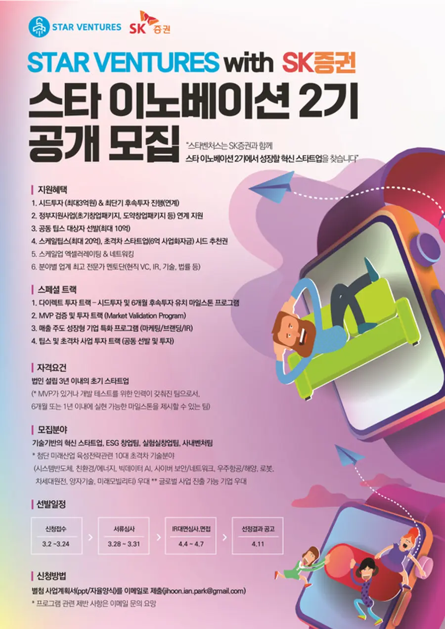 기술창업 액셀러레이터 스타벤처스가 SK증권과 함께 혁신 스타트업을 발굴해 유니콘 기업으로 성장할 수 있게 지원하는 유니콘 액셀러레이터 프로그램 '스타 이노베이션'에 참가할 2기 스타트업을 공개 모집한다고 7일 밝혔다.