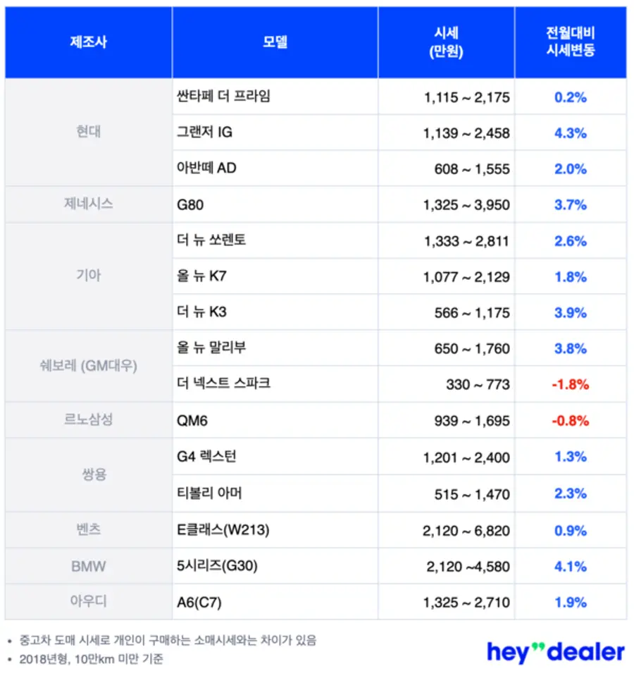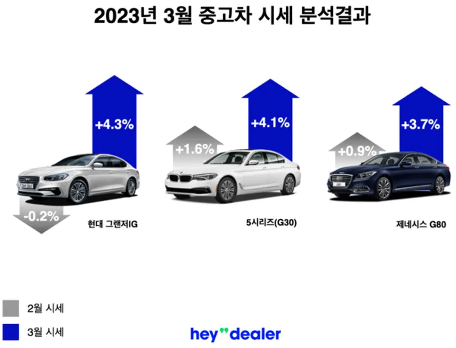헤이딜러 자료에 따르면 그랜저IG이 전월비 4.3% 상승하며 가장 큰 상승폭을 보였다. 5시리즈(G30) 4.1%, 제네시스 G80이 3.7% 등 프리미엄 세단이 지난 1월 대비 시세 상승을 주도했다.