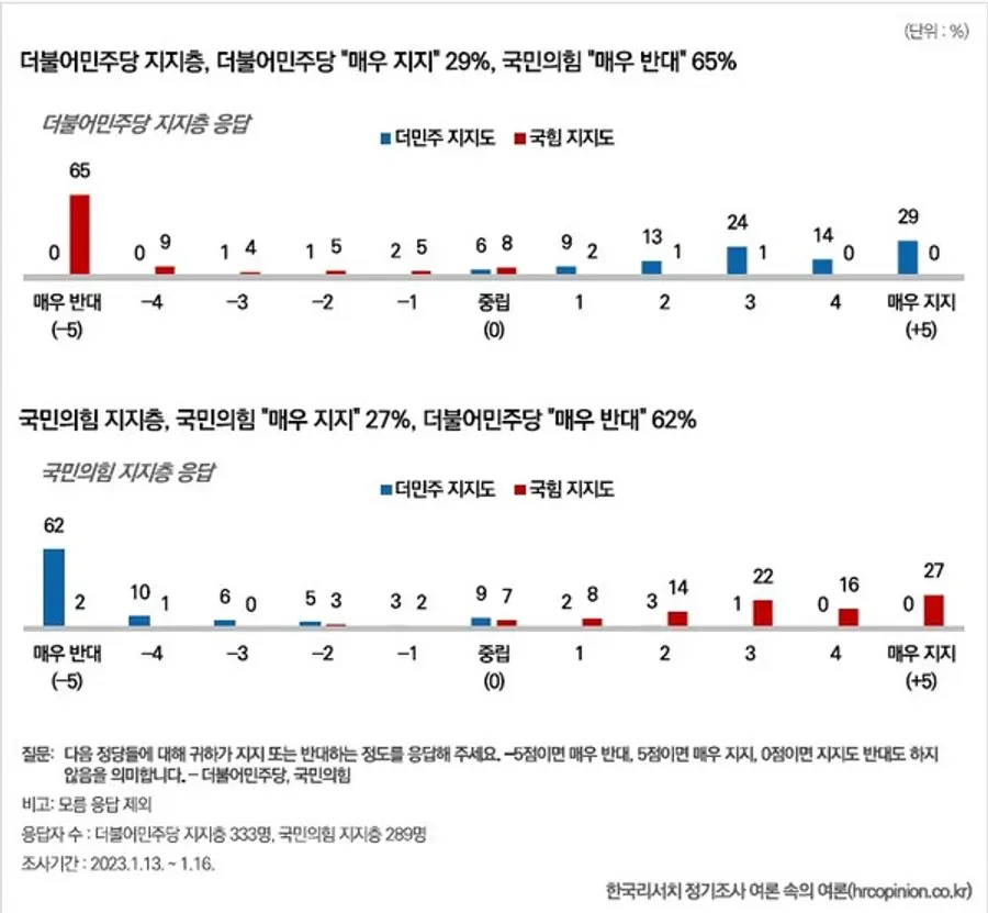 더불어민주당 지지층 가운데 더불어민주당을 “매우 지지”하는 사람은 29%, 국민의힘을 “매우 반대”하는 사람은 65%였다. 국민의힘 지지층 중에서는 27%가 국민의힘을 “매우 지지”하고, 62%가 더불어민주당을 “매우 반대”했다.