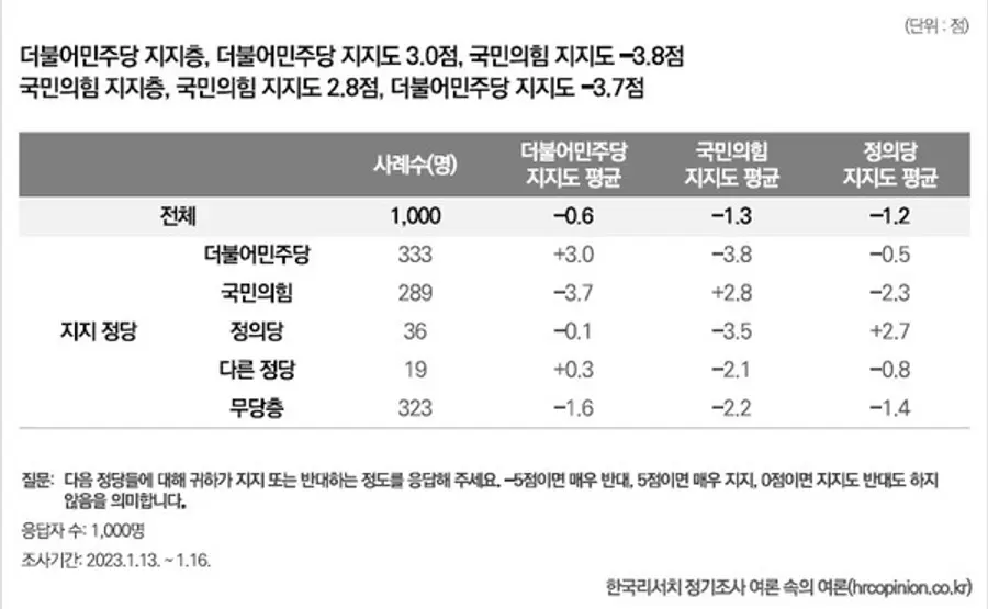 자신이 지지하는 정당에 대한 지지도 평균에 비해 상대 당에 대한 부정적인 인식이 강하다. 특히, 국민의힘 지지층의 경우 정의당(-2.3점)보다 더불어민주당(-3.7점)을 반대하는 정도가 더 높게 나타나는 것도 특징이다.