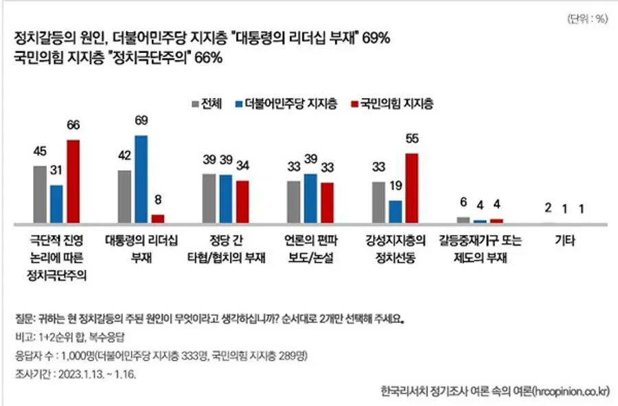 극단적 진영 논리에 따른 정치극단주의와 대통령의 리더십 부재가 정치갈등의 주된 요인으로 꼽혔다.