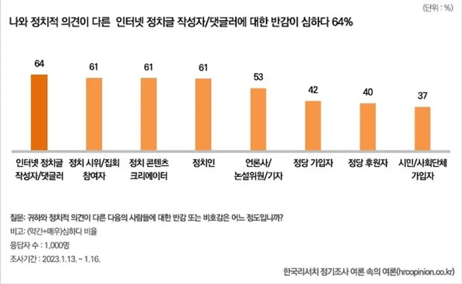 한편, 정치적 반감의 대상은 종전 레거시 미디어보다는 온라인 및 뉴미디어 행위자에 집중된 것으로 조사됐다. 인터넷 정치글 작성자와 댓글러에 대한 반감이 상대적으로 큰 것으로 조사됐다.