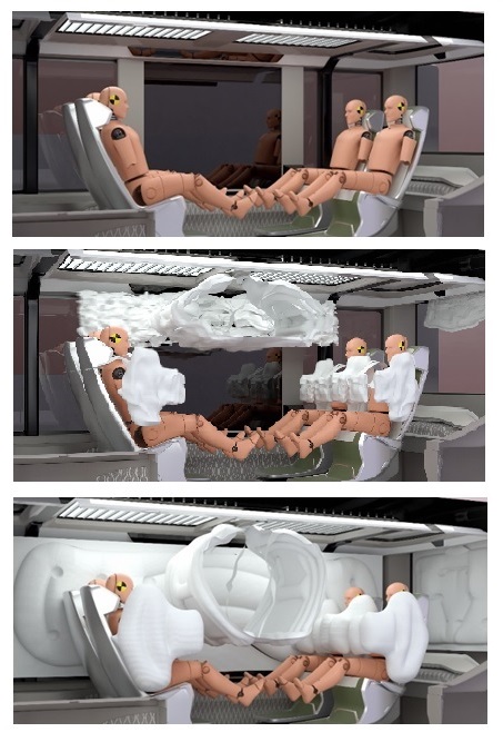먼저 ‘대면착좌 에어백’이 차량 천정 중앙에서 터져 마주보는 승객의 충돌을 방지한다. 창문과 지붕의 연결부 네 곳에선 ‘커튼 에어백’이 이름 그대로 실내 사방을 커버하며 쏟아져 내린다. 이에 더해 좌석 시트 뒷면 좌우에서 작동하는 ‘전방위 에어백’은 탐승객의 몸을 감싸는 일종의 보호막 역할을 해준다.