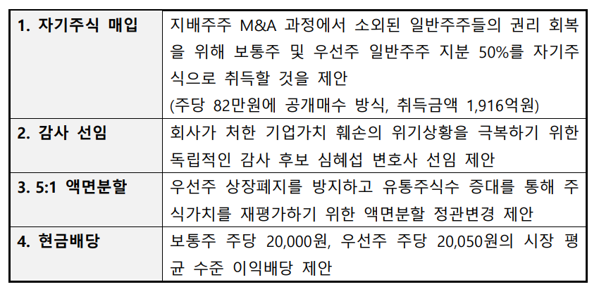 차파트너스자산운용(이하 차파트너스)이 제안한 주당 2만원의 배당과 5분의 1 액면분할, 그리고 1900억원 규모의 자사주 매입 안건이 상정된다. 또 차파트너스가 추천한 심혜섭 심혜섭법률사무소 대표 변호사의 감사 선임안건도 주총에 오른다.