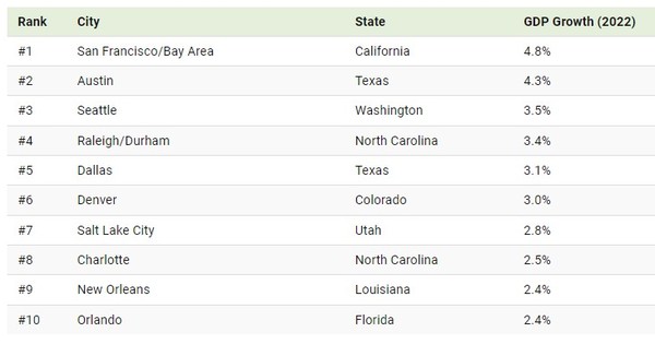 특히, 첨단 산업 일자리, 원격 근무 및 상대적으로 저렴한 주거비 역시 이들 도시의 장점으로 꼽힌다. 좋은 기후 여건도 이들 도시의 성장세에 일조하고 있다.