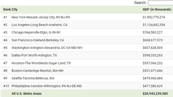 총생산(GDP)를 기준으로 한 도시순위에서는 뉴욕, 로스엔젤레스 시카고 순으로 나타났다.