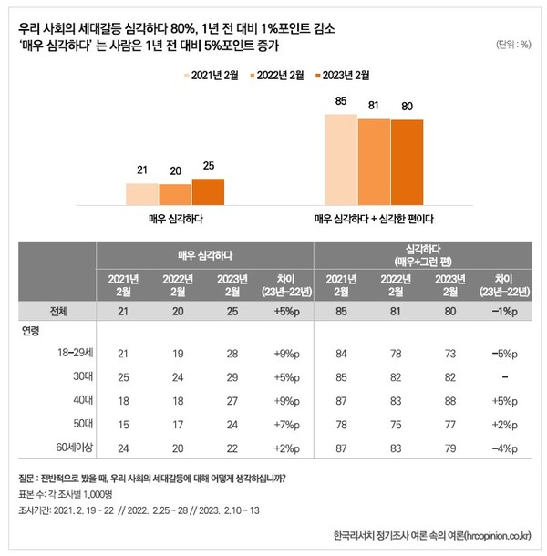 세대갈등이 매우 심각하다는 답변은 20대에서 28%를 차지했다. 2021년과 2022년 각각 21%와 19%에서 열 명 중 3명꼴로 세대갈등을 심각하게 인지하는 것.
