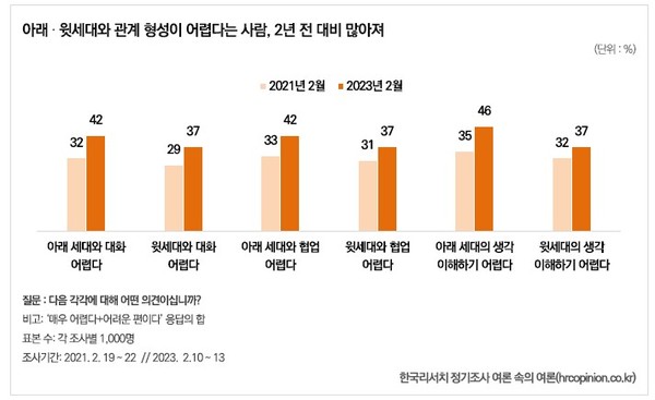 특히 20대와 40대에서 세대갈등이 매우 심각하다고 느끼는 비율이 2021년과 2022년에 비해 점점 더 늘고 있는 것으로 나타났다.
