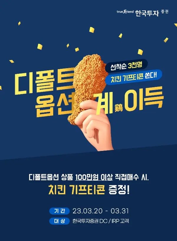 이번 이벤트는 3월 31일까지 확정기여형(DC) 또는 개인형퇴직연금(IRP) 계좌로 디폴트옵션 포트폴리오 상품을 100만원 이상 매수하면 선착순 3000명에게 모바일 치킨, 콜라 교환권을 지급한다.