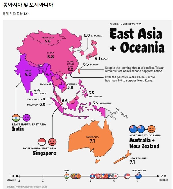 우리나라가 포함된 동아시아와 오세아니아의 평균 행복지수는 5.6으로 집계됐다. 하지만 호주가 7.1점으로 이 지역의 평균 행복지수 점수를 상향시켰다.