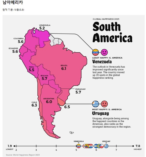 남아메리카의 평균 점수는 5.8를 기록했다. 베네수엘라의 체감 행복도가 가장 낮았지만 지난해 4.9에서 5.2로 향상됐다. 현재 진행 중인 인도주의적 위기와 경제 위기는 여전히 다수의 베네수엘라인에게 희망이 되지 못하고 있다. 2014년 이후 680만 명이 넘는 사람들이 이 곳을 탈출했다.