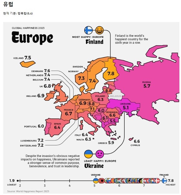 지난해부터 전쟁중인 우크라이나와 러시아는 전쟁에도 불구하고, 행복지수가 낮아지지 않았다. 다수의 우크라이나인드링 자유를 위한 투쟁에서 오히려 회복력과 목적의식을 느끼고 있는 것으로 풀이된다. 러시아인의 행복지수 역시 지난해(5.5)보다 0.2점 오른 5.7을 기록했다.