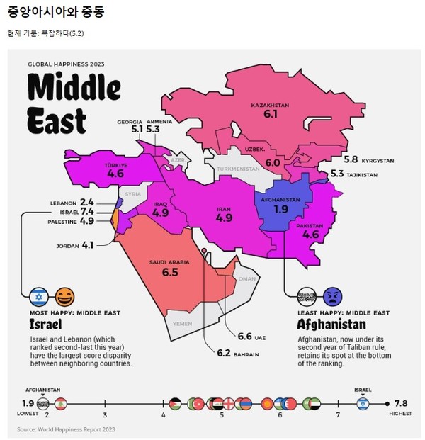 이스라엘이 상위 10위권에 첫 진입한 것이 그나마 이 지역의 유일한 긍정적인 모습이다. 사우디아라비아와 UAE는 유럽과 대등한 수준의 행복도를 과시했다.