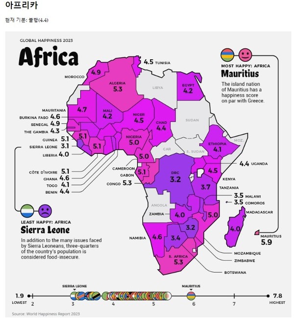 지구상 가장 행복하지 못한 지역은 아프리카. 아프리카 대륙의 평균 행복지수는 4.4 점에 그쳤다. 나라별 편차 역시 극심하다. 아프리카에서 가장 높은 점수를 받은 나라는 섬나라 모리셔스. 국가의 자연미와 안정성 외에도 균등한 경제적 기회가 국민의 행복도를 증진시키고 있다. 모리셔스는 세계은행에 의해 중상위 소득 국가로 분류되며 세계에서 가장 빠르게 성장하는 고소득시장 중 하나이다.