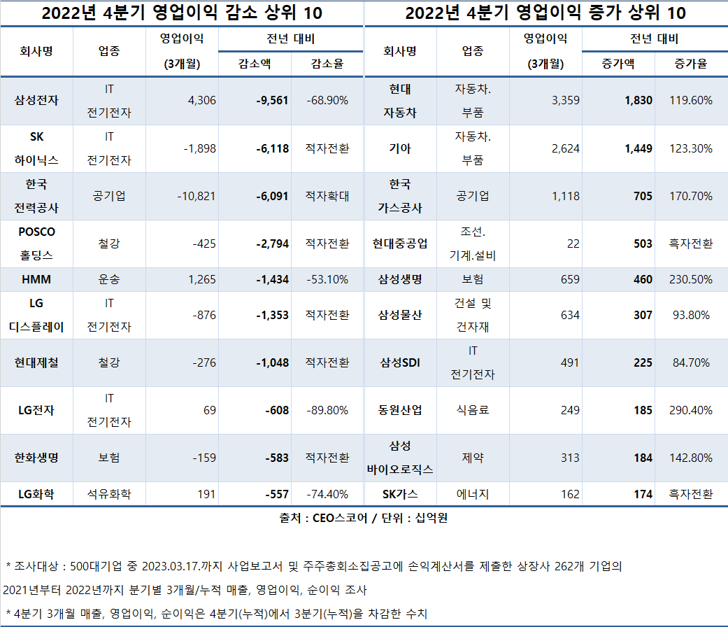 22일 기업데이터연구소 CEO스코어(대표 김경준)가 국내 매출 상위 500대 기업 중 지난 17일까지 실적 확인이 가능한 262곳의 지난해 4분기 실적을 조사한 결과, 이들 기업의 전체 매출액은 662조4211억원으로, 2021년 동기(595조4197억원) 대비 11.3%(67조14억원) 증가했다.