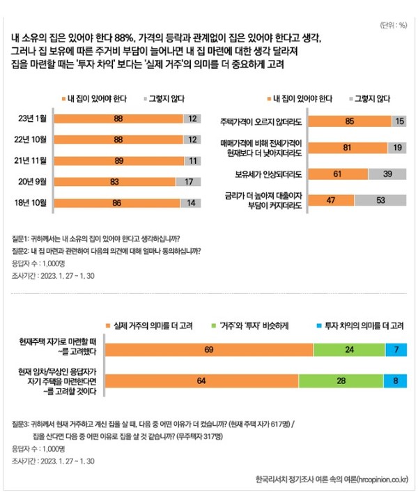 22일 한국리서치가 지난 1월27일부터 30일까지 나흘간 전국 만 18세 이상 성인 남녀 1000명을 대상으로 부동산 가격 변동, 세계 경제 및 정책 변화 속에서 주택 및 부동산에 대한 생각이 어떻게 달라졌는지, 그리고 현 정부의 부동산 정책에 대해 어떻게 평가하는지를 조사했다. 95%신뢰수준에서 최대 허용 표집오차는 ±3.1%p.