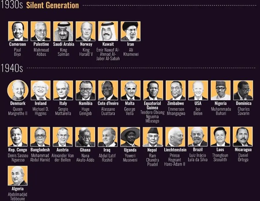 세번째로 많은 수의 그룹은 침묵의 세대로 불리는 78세 이상 국가원수군. 총 29명(15.1%)이 각국을 이끌고 있다. 조 바이든 미국 대통령(81세)이 대표 기수이다. 카메론의 폴 비야 대통령이 90세로 최연장자이다. 폴 비야 대통령은 지난 달 90세 생일 잔치를 벌였다. 카메룬 국민의 평균 연령이 18.5세에 그친다. 아프리카 대륙에 침묵의 세대 출신이 상대적으로 많이 분포됐다.