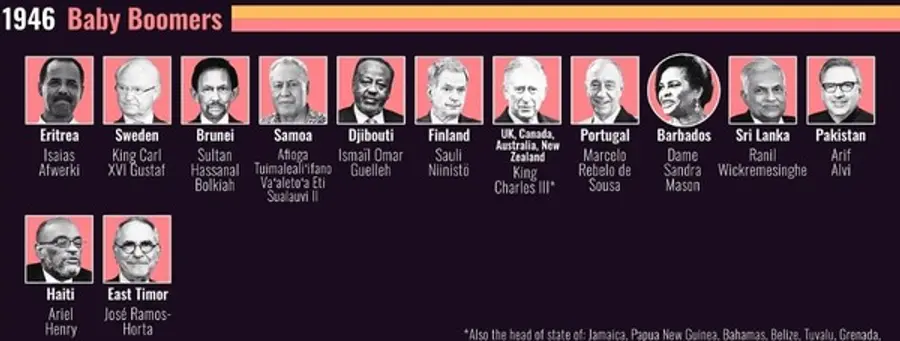 윤석열 대통령과 일본의 나루히토 국왕이 60년생으로 올해 63세로 이 그룹에 포함됐다. 인구대국 인도의 드라우파디 무르무 대통령(65세)과 중국의 시진핑(70세) 역시 베이비붐세대군의 대표 기수들이다. 영국의 찰스 3세왕, 페루의 Dina Boluarte 대통령, 온두라스의 Xiomara Castro 대통령이 이 그룹에 포함됐다.
