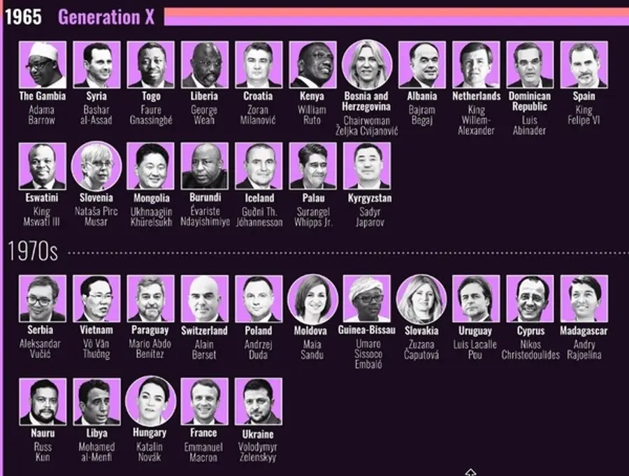 X세대라 통칭되는 43세∼58세가 38명(19.8%)으로 베이비붐 세대 출신 다음으로 많은 수를 차지하고 있다. 이 그룹의 대표는 최근 프랑스 연금 개혁을 이끌어낸 에마뉘엘 마크롱 프랑스 대통령이다. 우크라이나(Volodymyr Zelenskyy), 헝가리(Katalin Novák) 역시 X세대 대통령이 국가를 이끌어가고 있다.