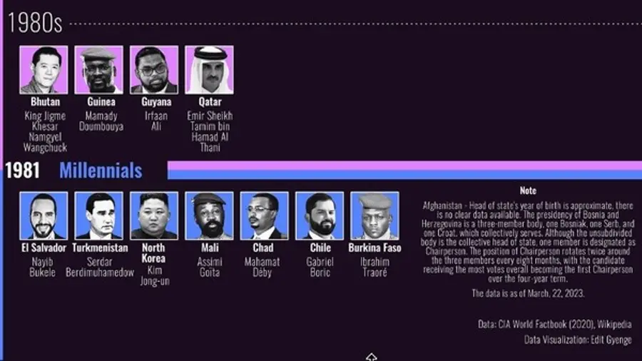 35세∼42세인 밀레니엄세대는 7명(3.6%)으로 집계됐다. 35세의 이브라힘 트라오레는 지난해 9월 쿠데타 이후 부르키나파소에서 최연소 국가 수반에 올랐다. 북한의 김정은과 칠레의 가브리엘 보릭 역시 이 그룹의 대표 기수로 꼽힌다.