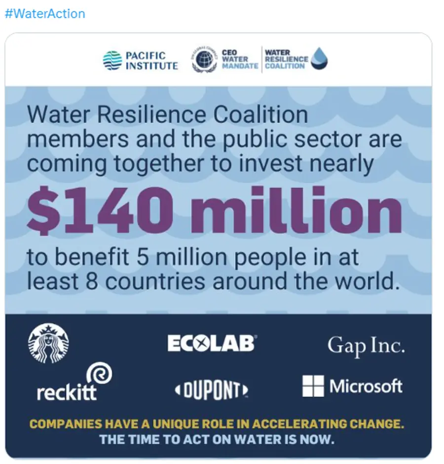 글로벌콤팩트의 게시글은 "물 부족, 오염 및 기후 변화로 인해 약 3000억 달러의 비즈니스 손실 위험이 있다. 물을 보호하기 위한 기업의 투자가 중요하다. 물은 공유 자원이기 때문에 공동의 노력이 필요하다. 함께해야 물을 보호할 수 있다"라고 강조하고 있다.